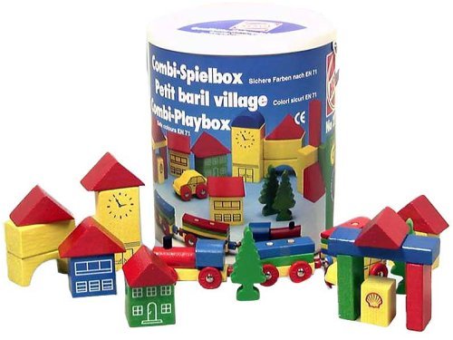 Heros Wooden Stacking Blocks 32 Piece Set "Little Town": Ages 2 & up. Heros toys are still made in Germany: made from PEFC or FSC-certified Germany & Austrian natural forest wood. Heros toys also meet the extensive requirements of European standard EN 71. Blocks are presented in a cardboard drum: 7" diameter x 9" tall. Ages 24 months & up.