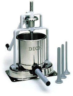 These are the top-of-the-line in hand stuffers. Made in Germany, the Friedrich Dick heavy duty stuffer will last for generations of use. Comes with a stainless steel cylinder, nylon piston, and air release. You can make 14 pounds of sausage easily with this machine.